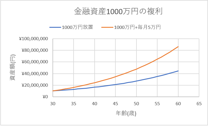 余裕があって金融資産1000万円に加えて毎月5万円の入金ができた場合は30年後に8000万円を超えます。