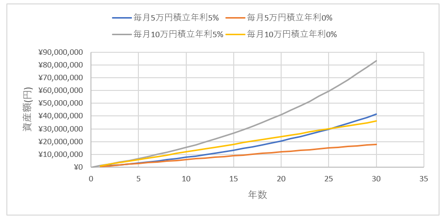 例として毎月5万円と毎月10万円で年利5%の場合と年利0%の場合の資産推移をシミュレーションしています。
