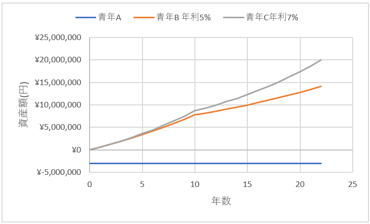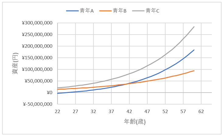 青年Aは22歳で-300万円の資産に対し、青年Bは1400万円、青年Cは2000万円近くの資産を持つことになります。