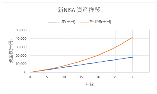 資産1000万円に到達するのは13年目ですね。以降も積立を継続させると新NISAの1800万円を30年かけて埋めるころには資産額4000万円に到達します。