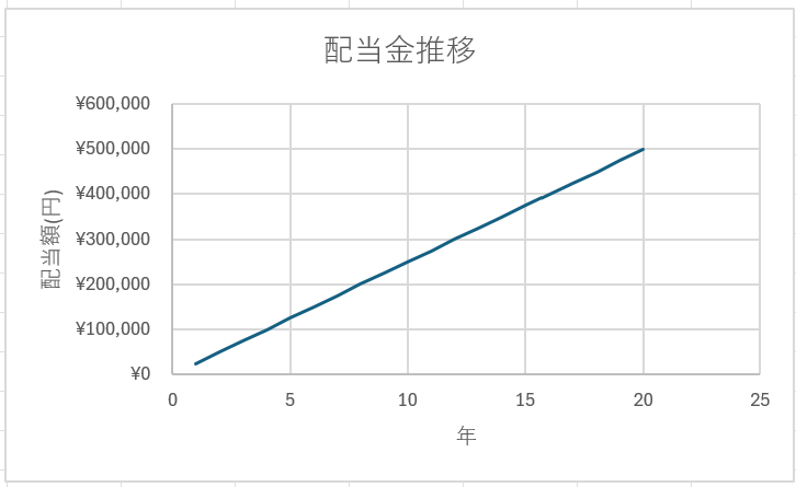 ざっくり計算ですがこんな感じで、20年後には年間配当50万円(月間約4万円)になります。