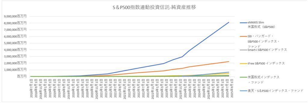 先日、全世界株式に連動する投資信託の純資産額の推移を記事にしたところいささか反響があったため、S&500についてもまとめてみることにしました。(2025年8月15日更新)